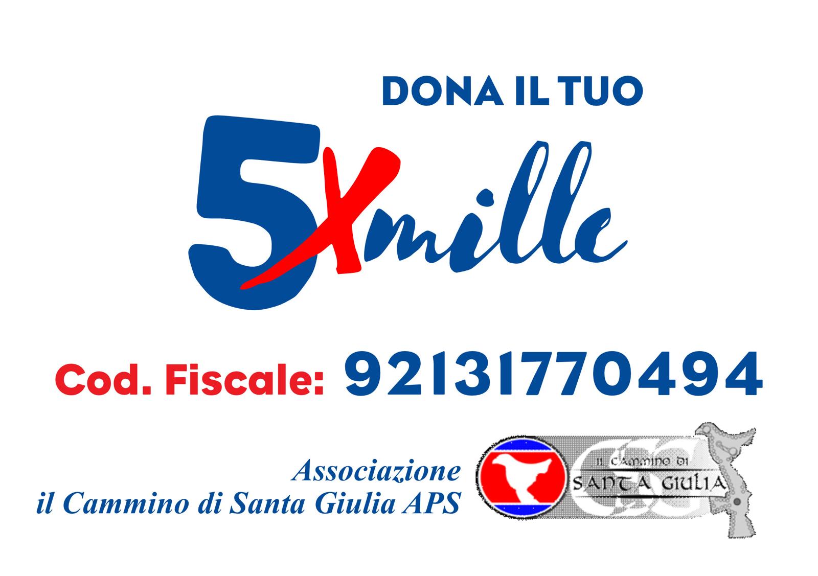 Con il tuo 5×1000 sostieni l’Associazione Il Cammino di Santa Giulia APS e i nostri progetti per valorizzare il territorio attraverso un itinerario culturale unico, ispirato alla Storia e alle Tradizioni locali. Il tuo contributo ci aiuta a far crescere il Cammino, a rivitalizzare i piccoli centri attraversati e a salvare antiche chiese ed edifici storici in stato di degrado, grazie a interventi mirati e concreti.